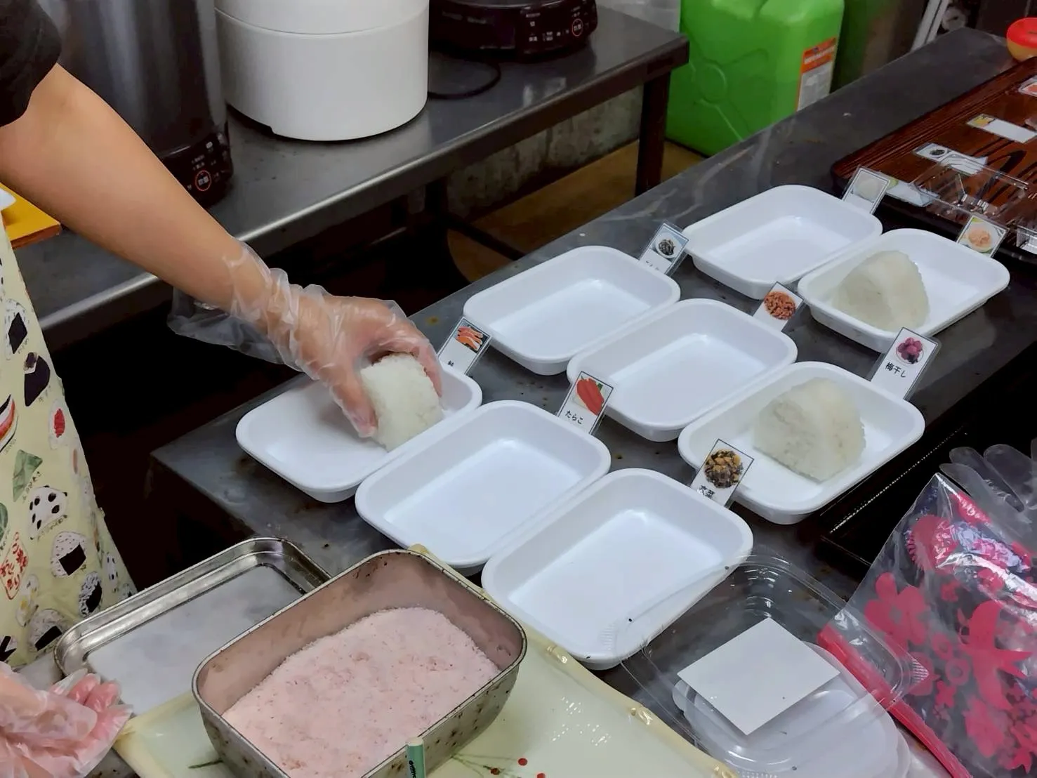 番号札で仕分け、安心のおにぎり作り 加須の就労支援B型作業所まごころです。ご注文いただいたおにぎりは、具材ごとにトレーへ分けて仕上げています。手袋を着用し、梅干し・たらこ・高菜などを加須産米でふっくらと結び、番号札を立てて取り…